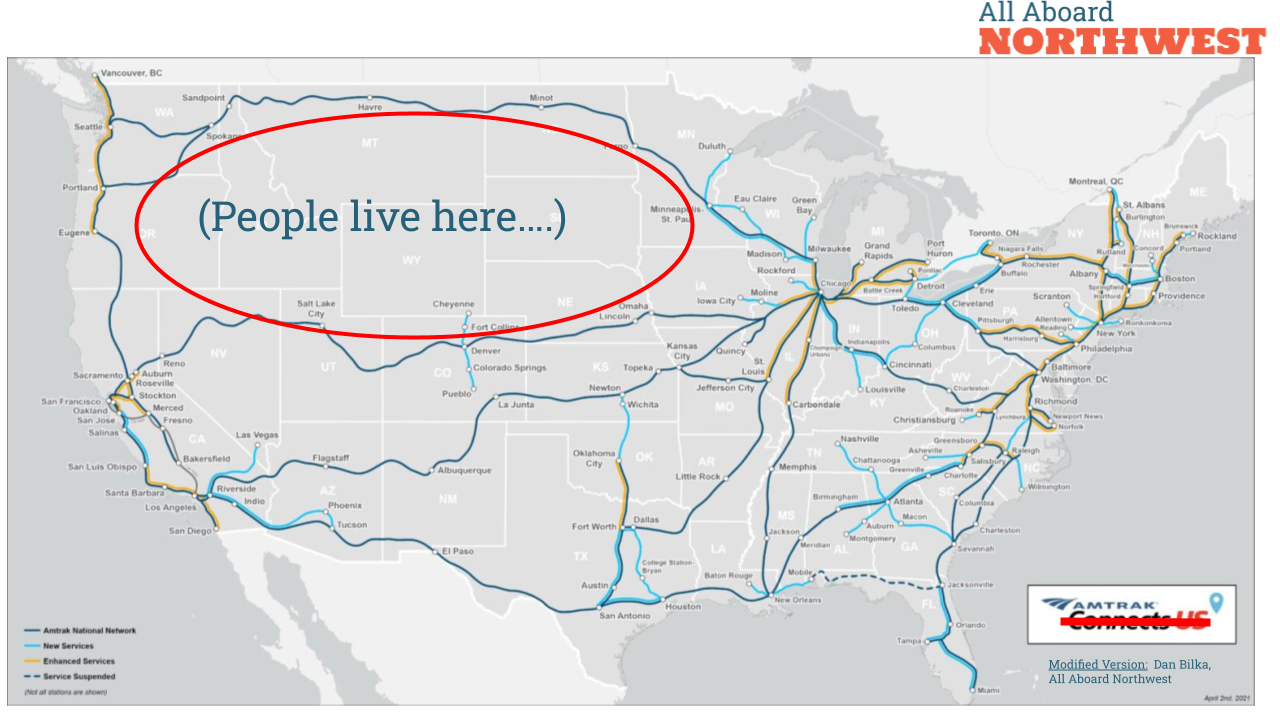 AANW again participated in Northwest and Midwest regional working group meetings to provide the Federal Railroad Administration with feedback on the Amtrak Daily Long-Distance Service Study. The working groups are bringing together state DOTs, Amtrak, Class I Railroads, metropolitan planning organizations, regional passenger rail authorities, local officials, federally recognized tribes, and the broader stakeholder community to evaluate how to better connect people with long-distance rail services. We discussed options for evaluating potential routes and how Amtrak and communities can work together to improve intercity passenger rail service.